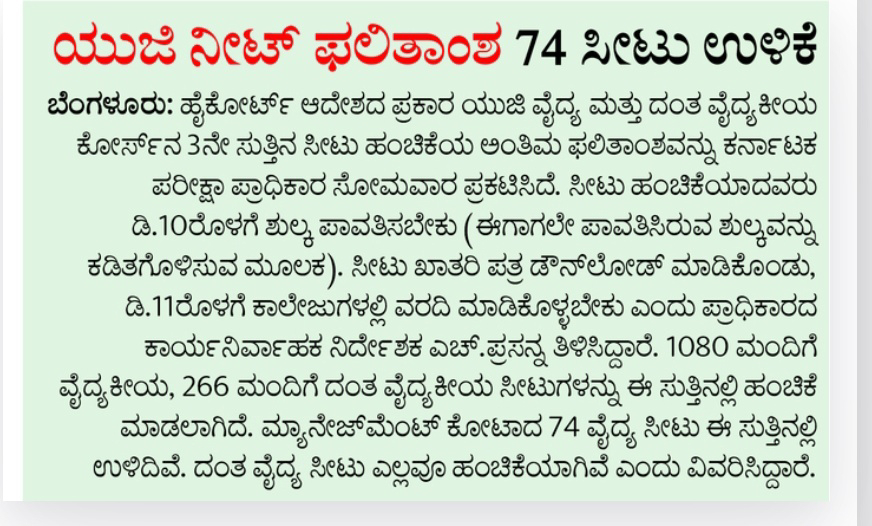 UG NEET result 74 seats remaining