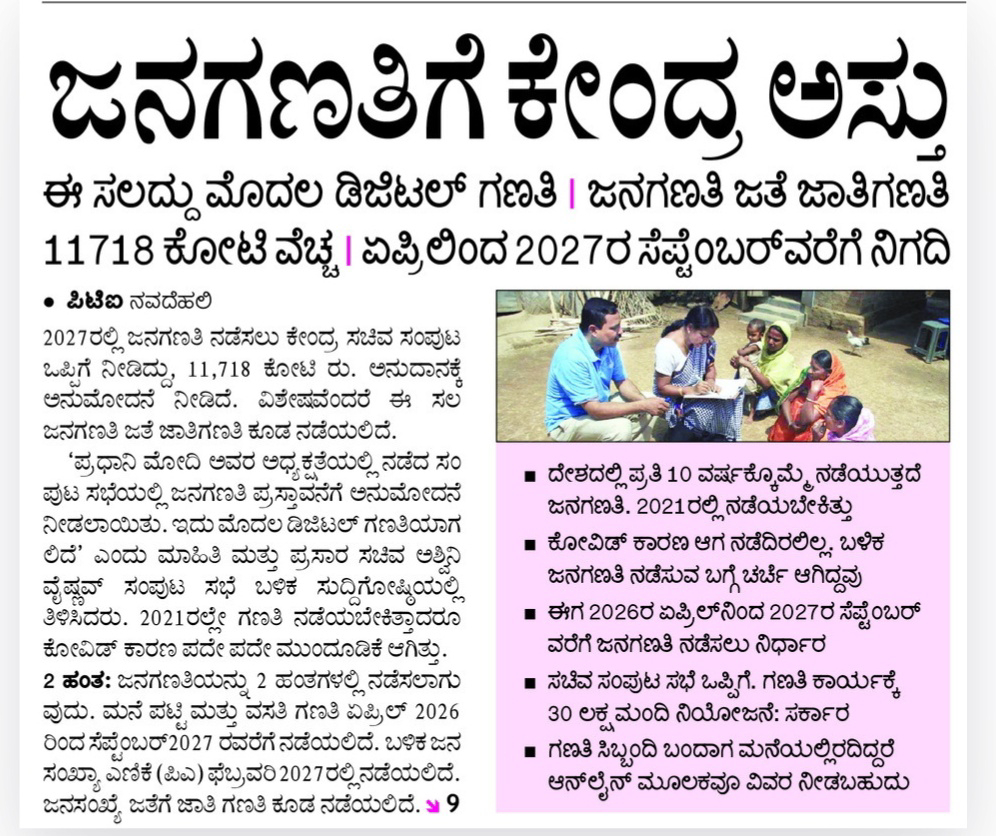 Census to be conducted by Centre – April 2026 to September 2027