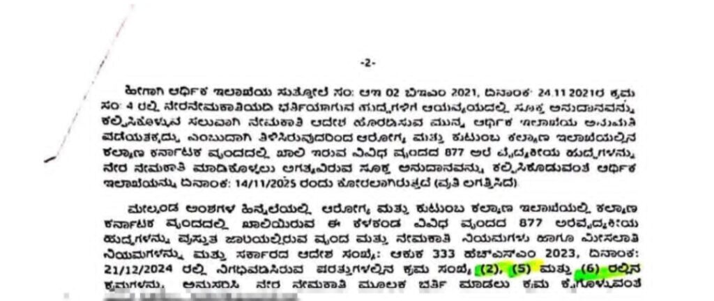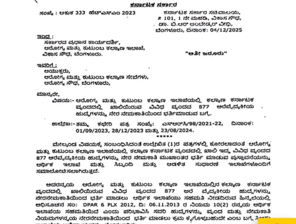 In relation to the above matter, the proposal to fill up 877 non-medical posts of various cadres in the Welfare Karnataka Division in the Department of Health and Family Welfare through direct recruitment as requested in the letters referred to (1) will be consulted with the Department of Finance and Personnel and CA Reforms Departments.