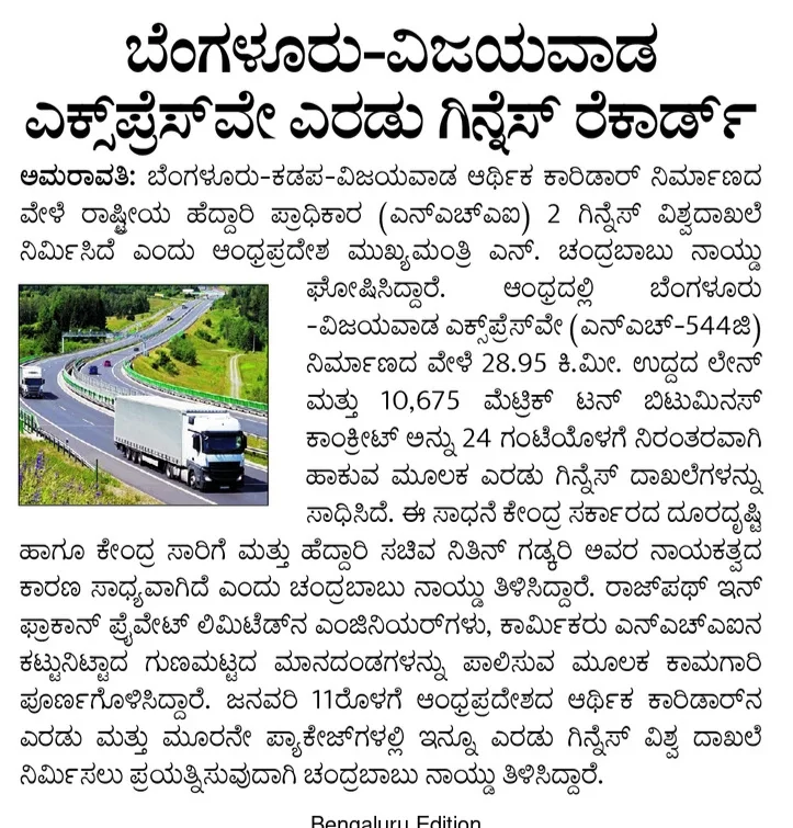 · Bengaluru-Vijayawada Expressway enters 2 Guinness records.