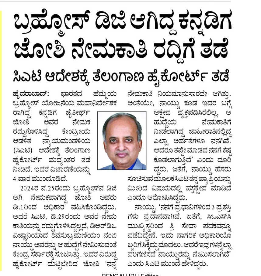 · Kannadiga Joshi, ex-Brahmos DG, suspended from his appointment.