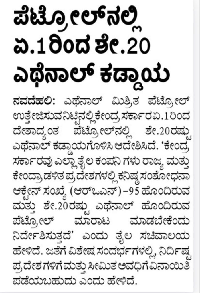 20% ethanol mandatory from petrol A1